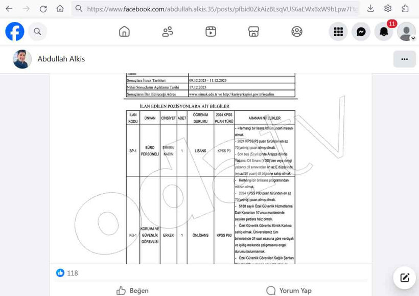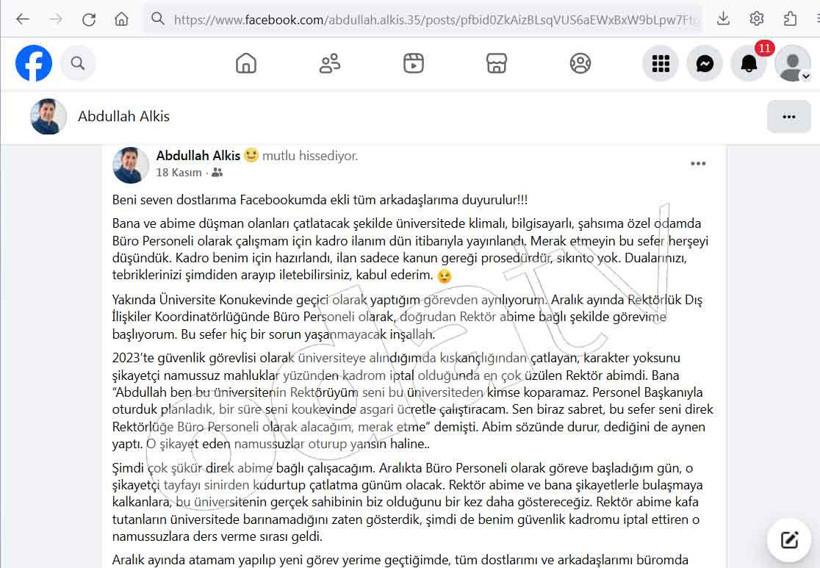 İlana başvuru süresinin dolmasına 14 gün kala yapılan ve akıllara durgunluk veren paylaşımda Abdullah Alkış, kendisi için özel oda ve bilgisayar dahi hazırlandığını, işe alım sürecinde “prosedür” gereği ilan açıldığını, ancak aslında tüm planlamanın çok önceden yapıldığını söyledi.