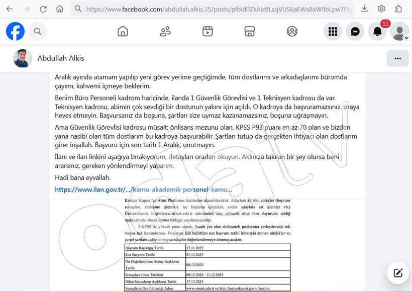 Abdullah Alkış, paylaşımında kendisi için açılan büro personeli kadrosunu itiraf etmekle kalmayıp aynı ilanda yer alan teknisyen kadrosunun da aile dostlarının yakını için açıldığını itiraf ettiği görüldü. Paylaşımının devamında Alkış, şunları dedi: