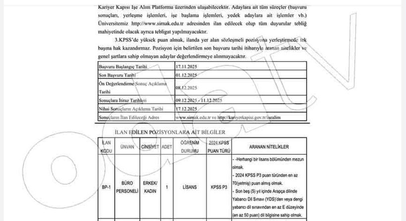 Ama güvenlik görevlisi kadrosu müsait; önlisans mezunu olan, KPSS P93 puanı en az 70 olan ve bizden yana nasibi olan tüm dostlarım bu kadroya başvurabilir. Şartları tutup da gerçekten ihtiyacı olan dostlarım girer inşallah. Başvuru için son tarih 1 Aralık, unutmayın.